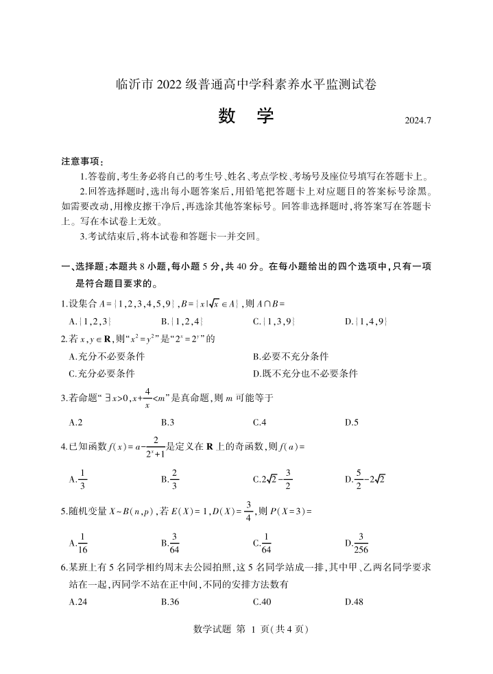 山东省临沂市2023-2024学年高二下学期期末考试 数学