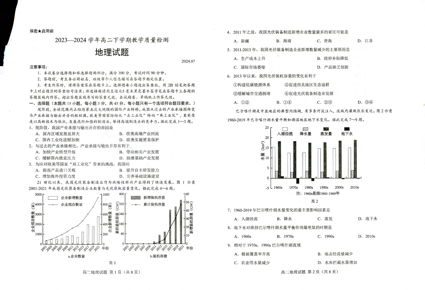 山东省菏泽市2023~2024学年高二下学期教学质量检测 地理