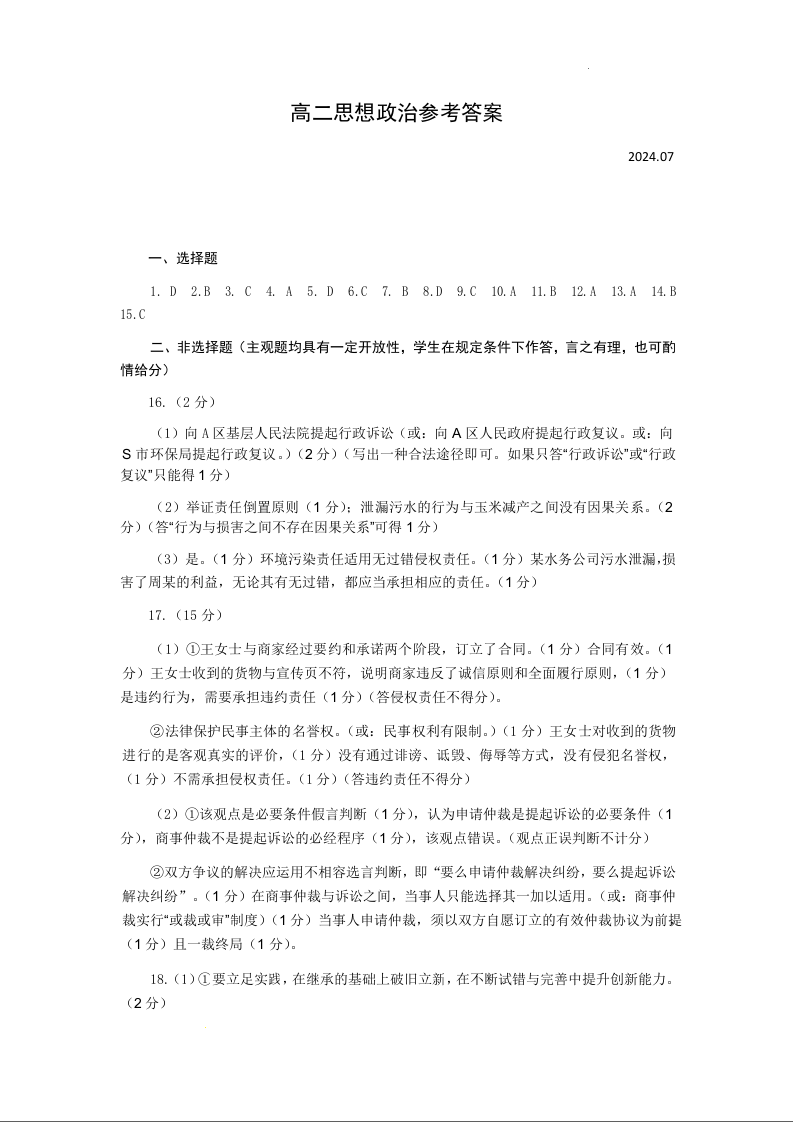 山东省菏泽市2023~2024学年高二下学期教学质量检测 政治答案