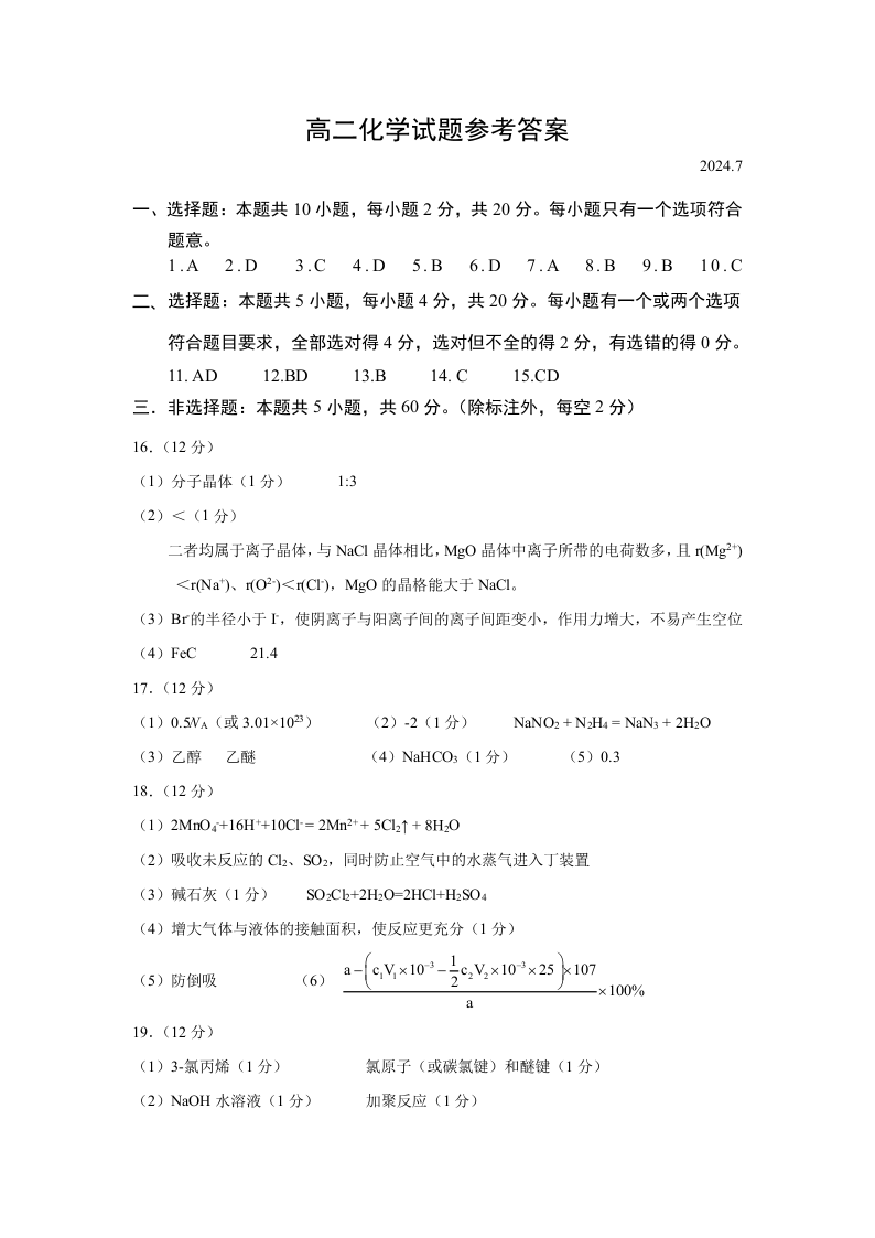 山东省菏泽市2023~2024学年高二下学期教学质量检测 化学答案