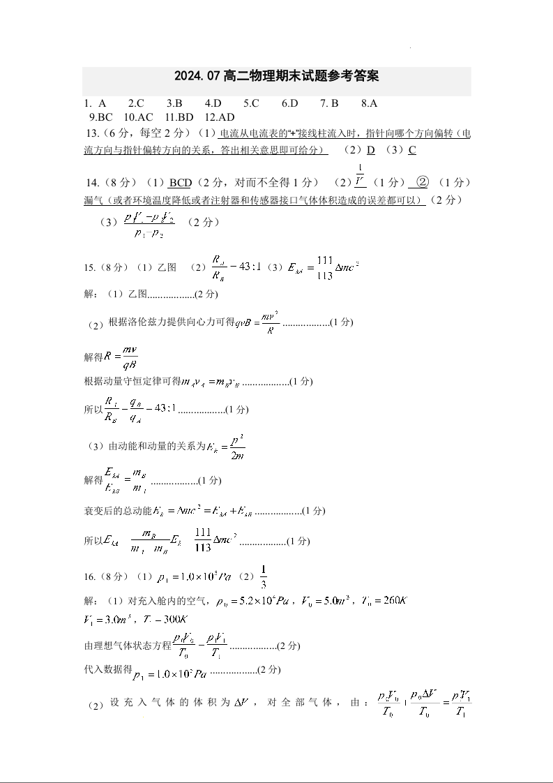山东省菏泽市2023~2024学年高二下学期教学质量检测 物理答案