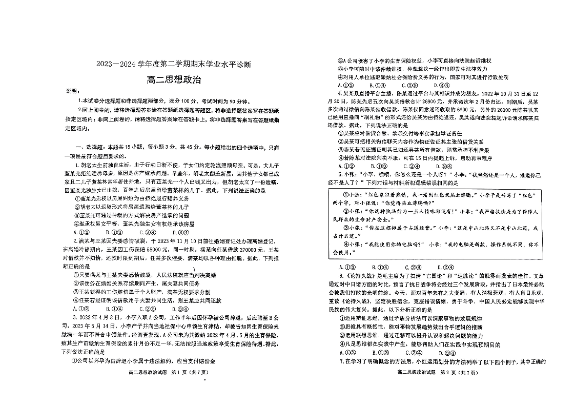 山东省烟台市2023-2024学年高二下学期期末学业水平诊断 政治