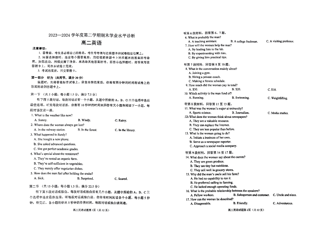 山东省烟台市2023-2024学年高二下学期期末学业水平诊断 英语