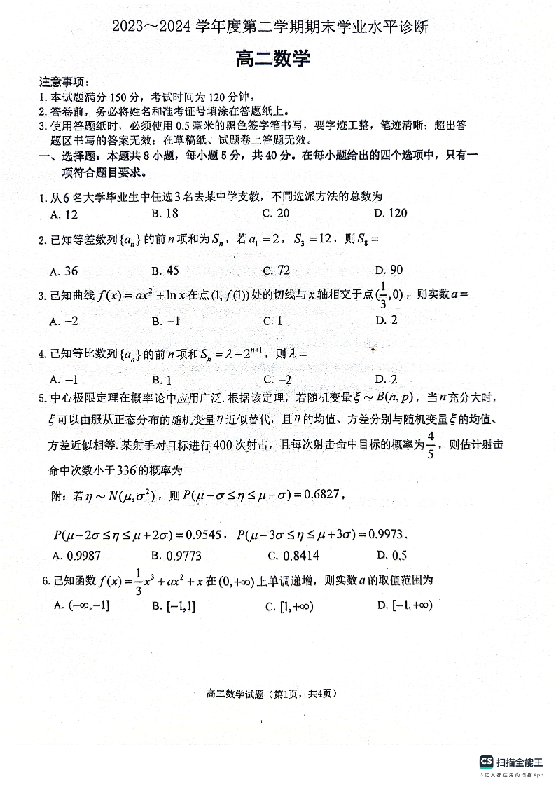 山东省烟台市2023-2024学年高二下学期期末学业水平诊断 数学