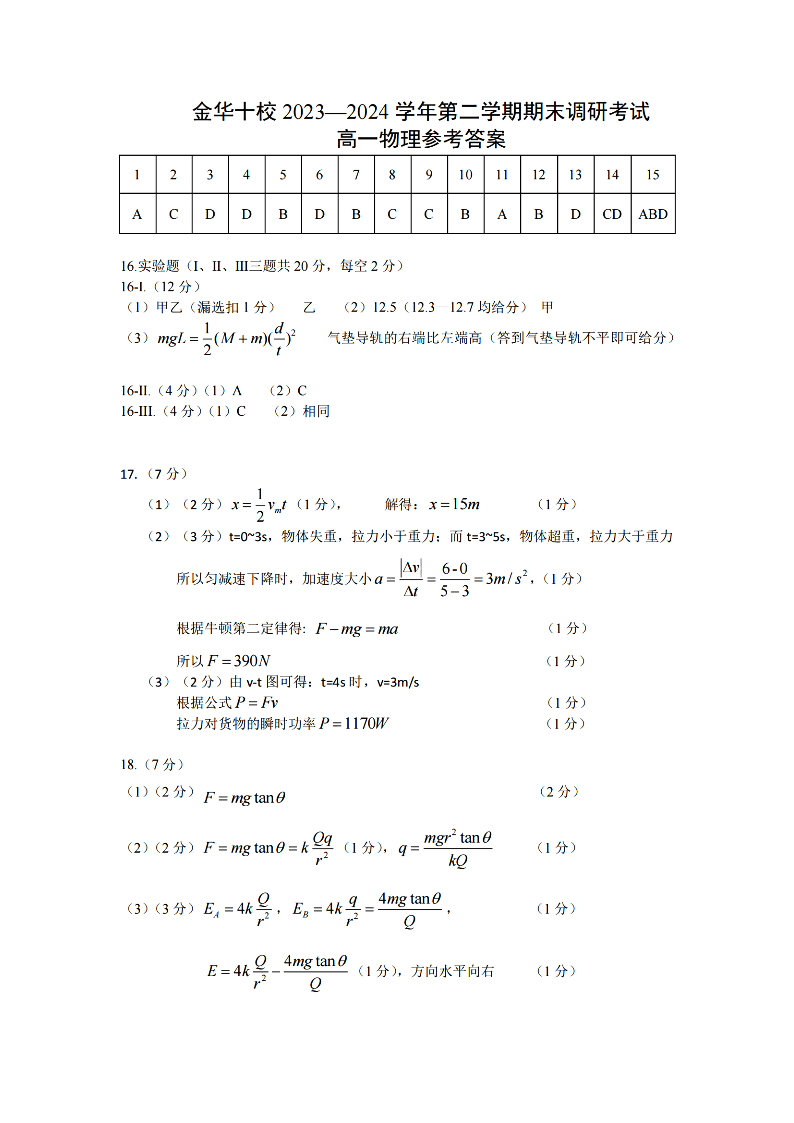 金华十校2023-2024学年高一第二学期期末调研测试 物理答案