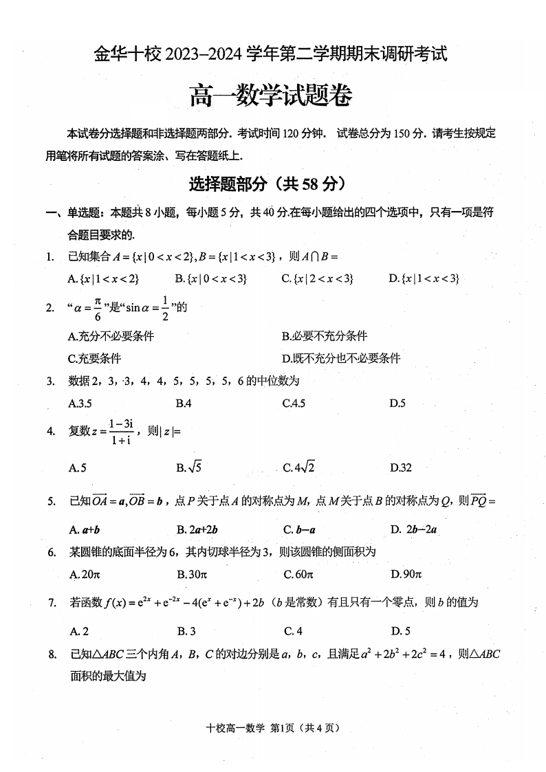 金华十校2023-2024学年高一第二学期期末调研测试 数学