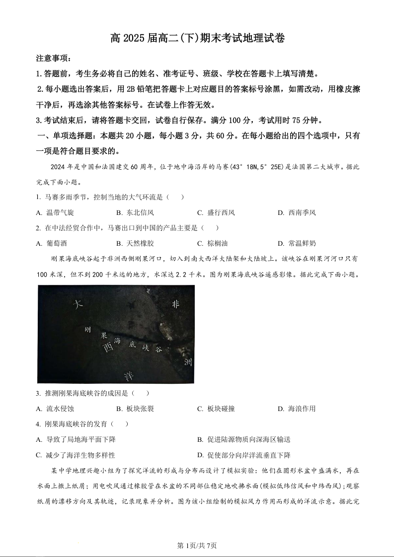 重庆市巴蜀中学校高2025届高二(下)期末考试 地理