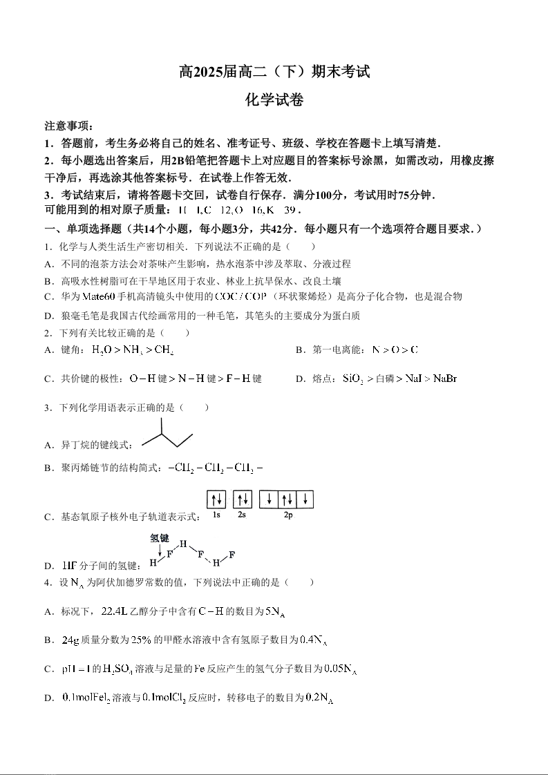 重庆市巴蜀中学校高2025届高二(下)期末考试 化学