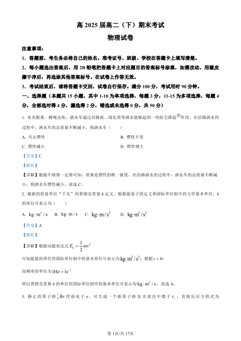 重庆市巴蜀中学校高2025届高二(下)期末考试 物理答案