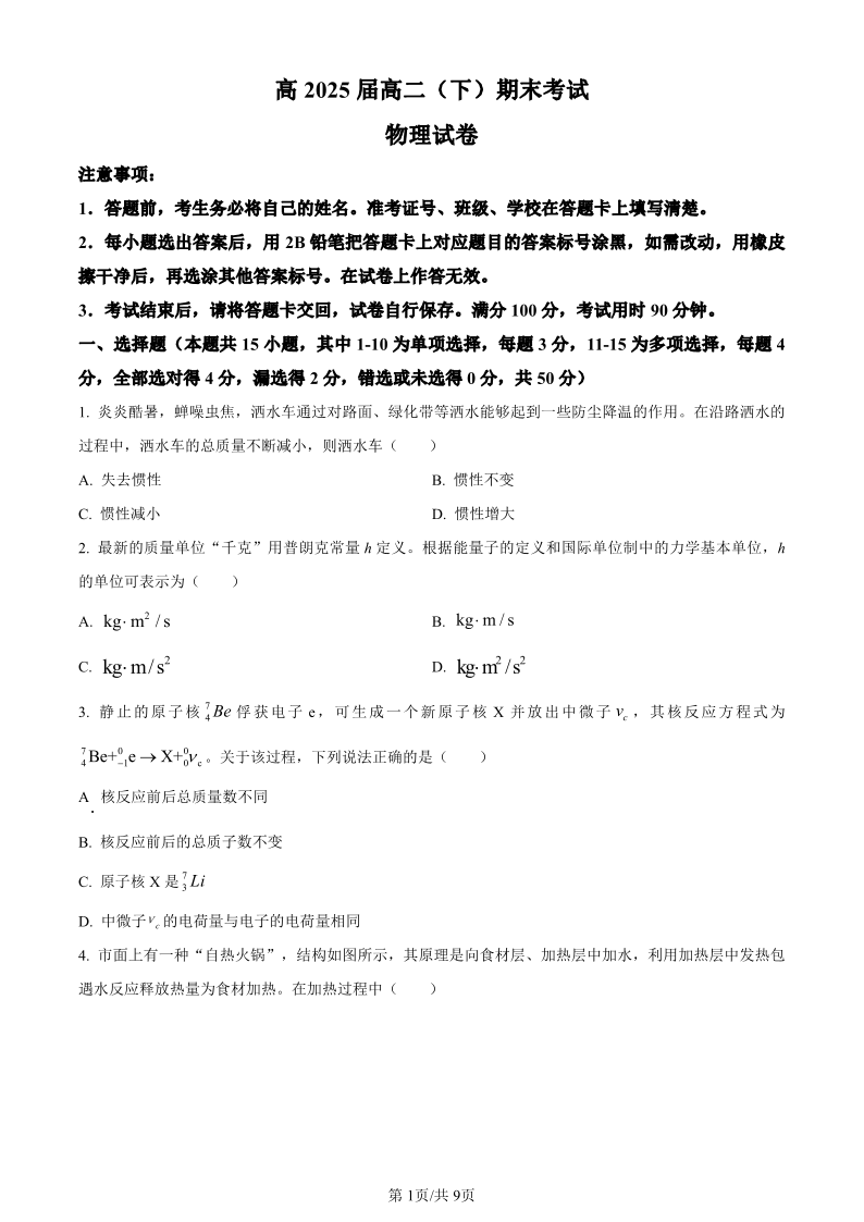 重庆市巴蜀中学校高2025届高二(下)期末考试 物理