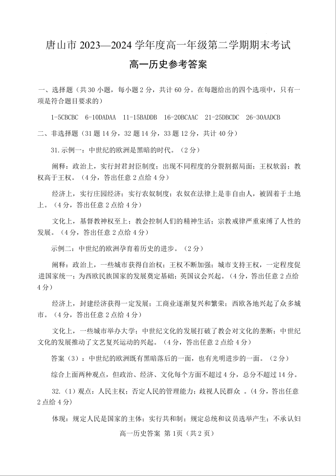 河北省唐山市2023-2024学年高一下学期期末考试 历史答案