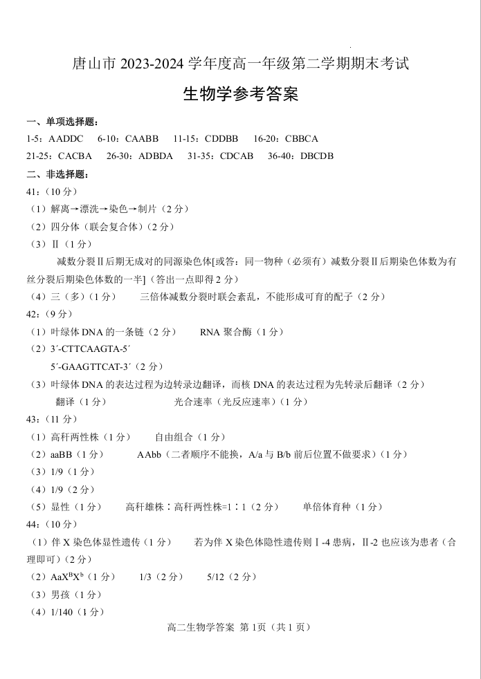 河北省唐山市2023-2024学年高一下学期期末考试 生物答案