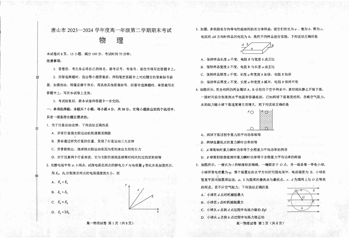 河北省唐山市2023-2024学年高一下学期期末考试 物理