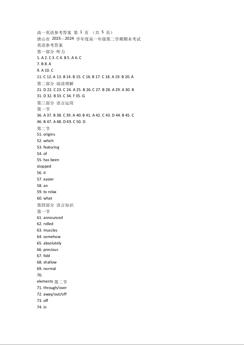 河北省唐山市2023-2024学年高一下学期期末考试 英语答案