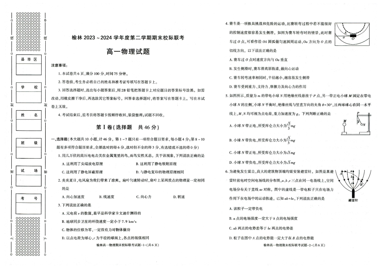 榆林2023-2024学年度高一第二学期期末校际联考 物理