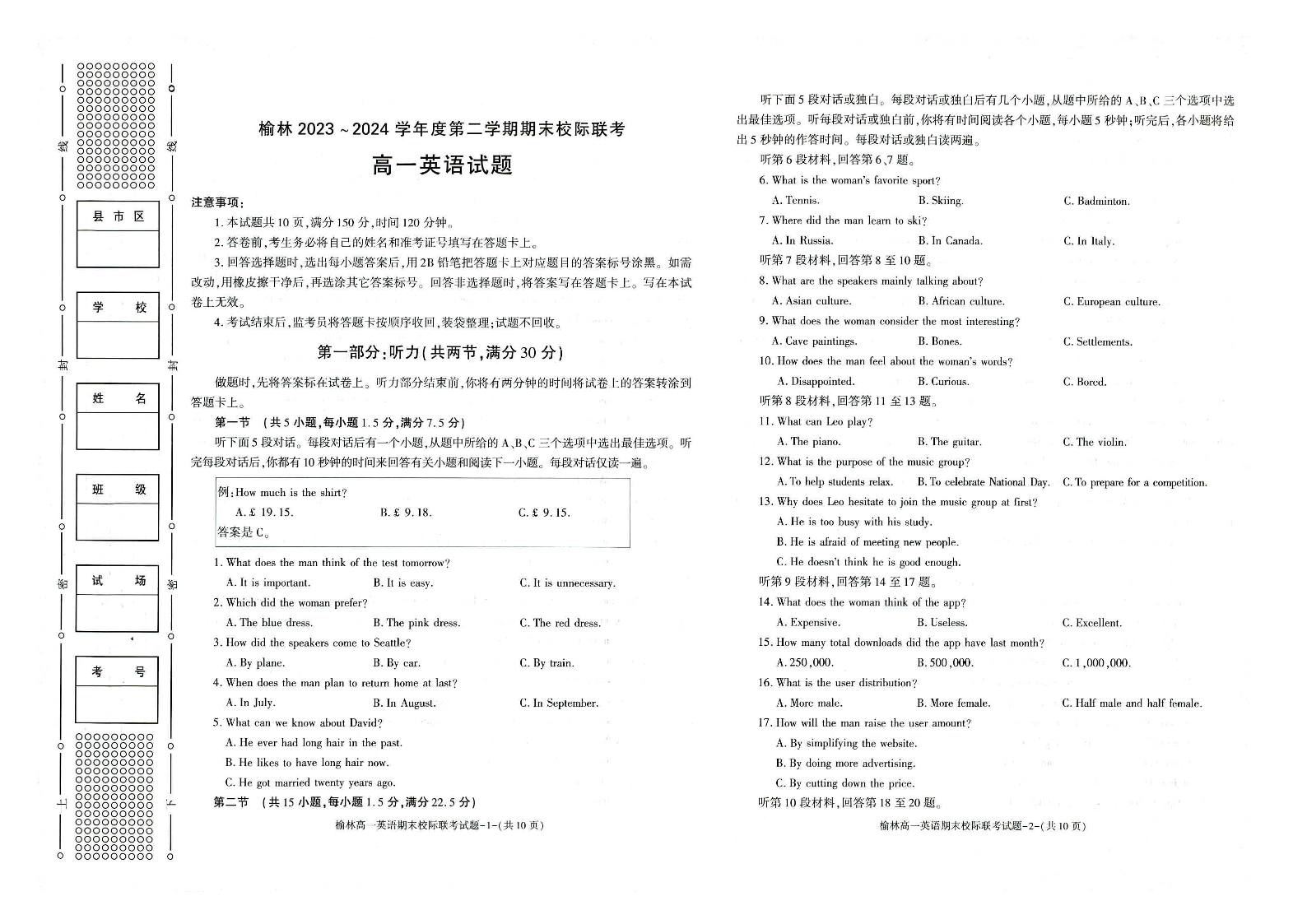 榆林2023-2024学年度高一第二学期期末校际联考 英语