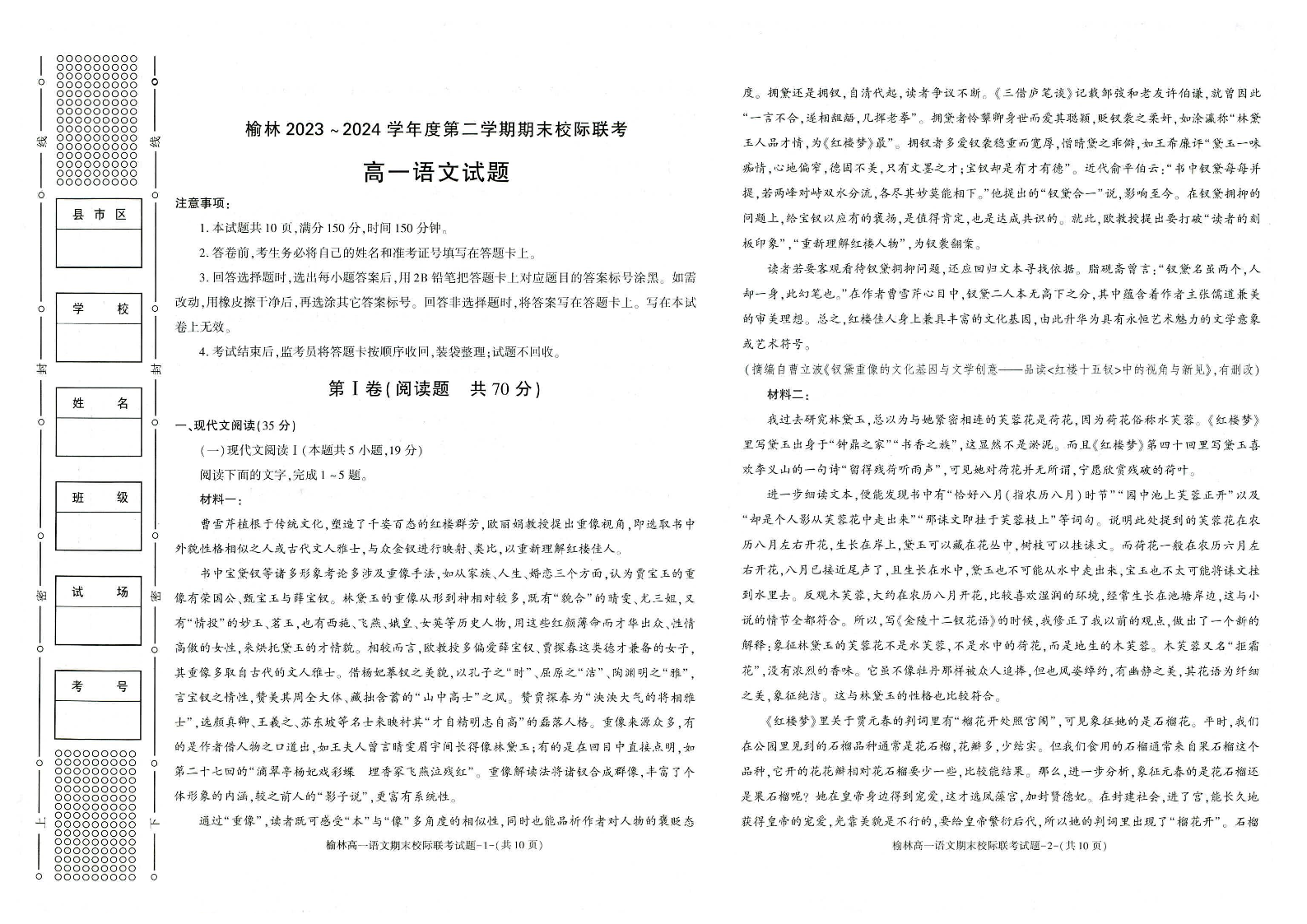 榆林2023-2024学年度高一第二学期期末校际联考 语文