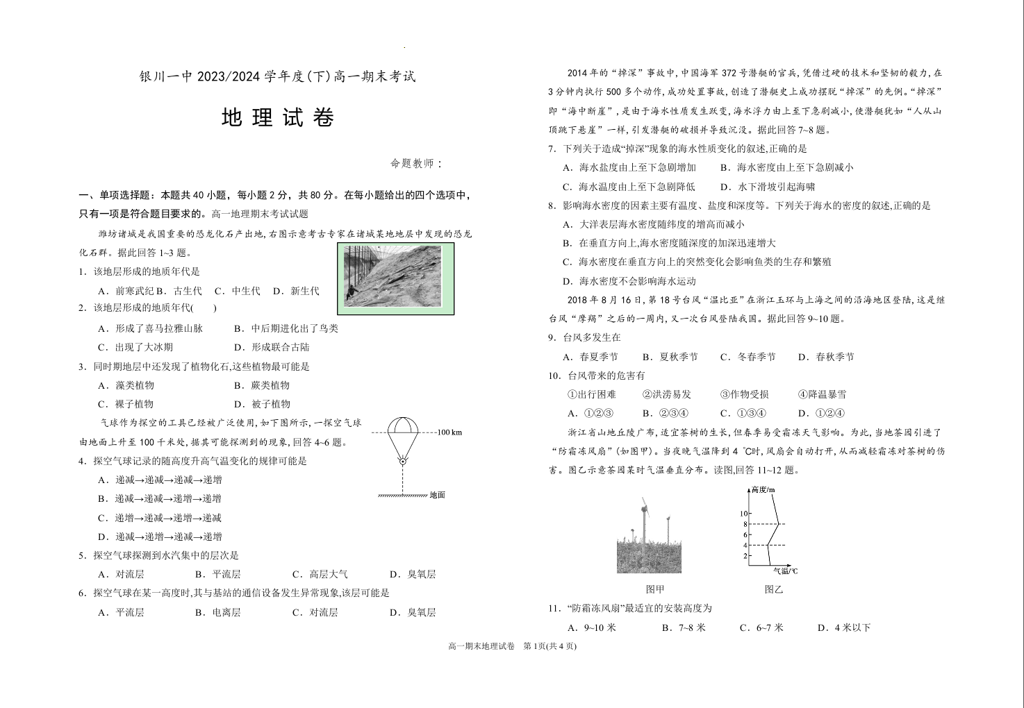 宁夏回族自治区银川一中2023-2024学年高一下学期期末考试 地理