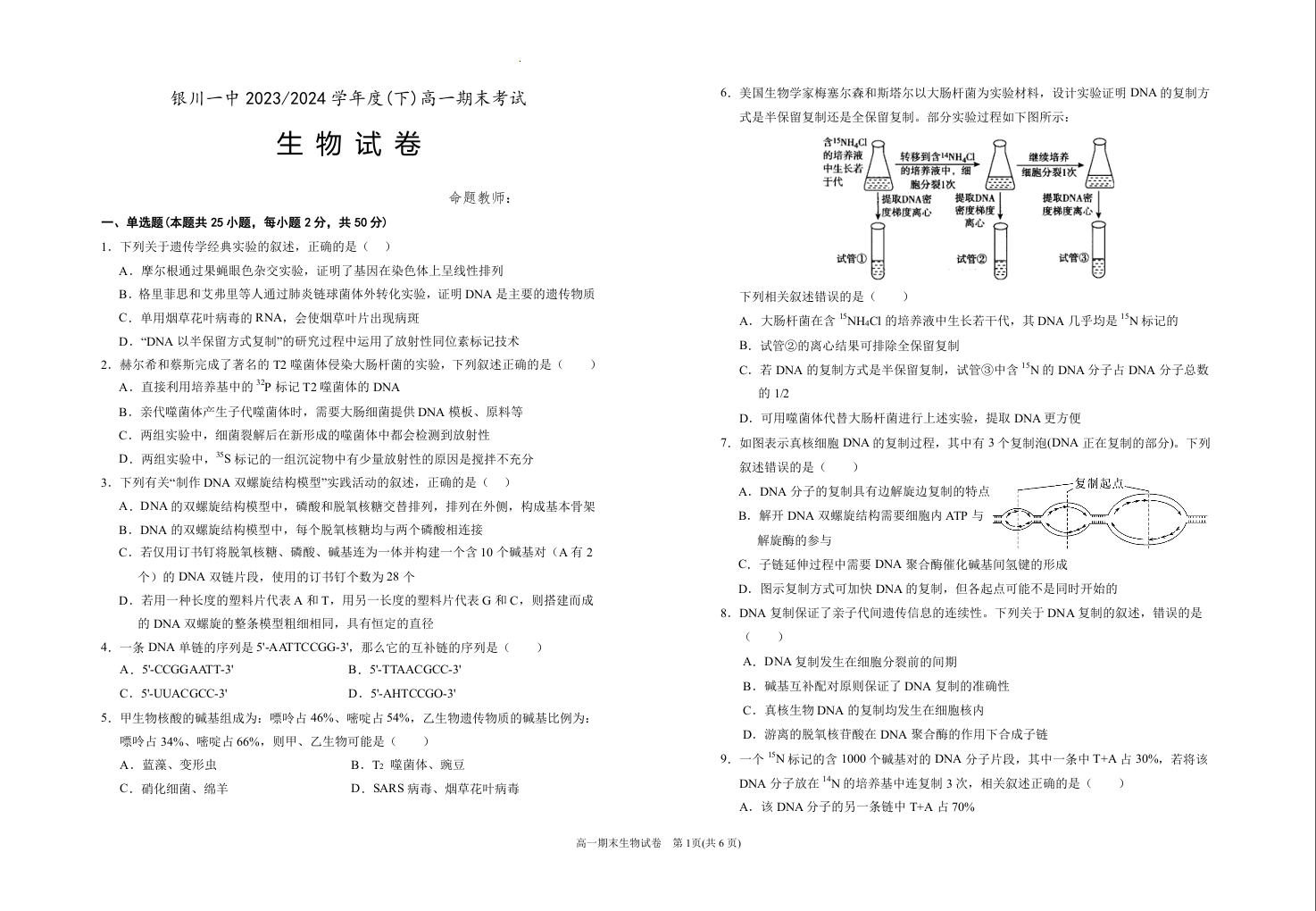 宁夏回族自治区银川一中2023-2024学年高一下学期期末考试 生物