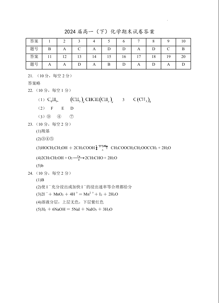宁夏回族自治区银川一中2023-2024学年高一下学期期末考试 化学答案