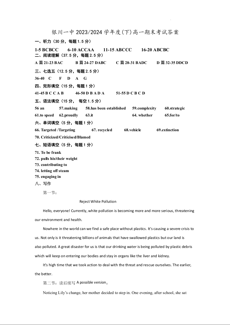 宁夏回族自治区银川一中2023-2024学年高一下学期期末考试 英语答案