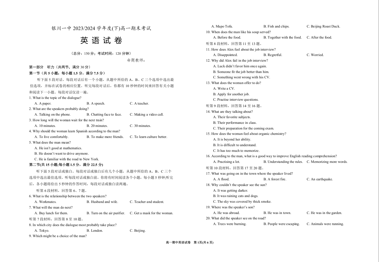 宁夏回族自治区银川一中2023-2024学年高一下学期期末考试 英语