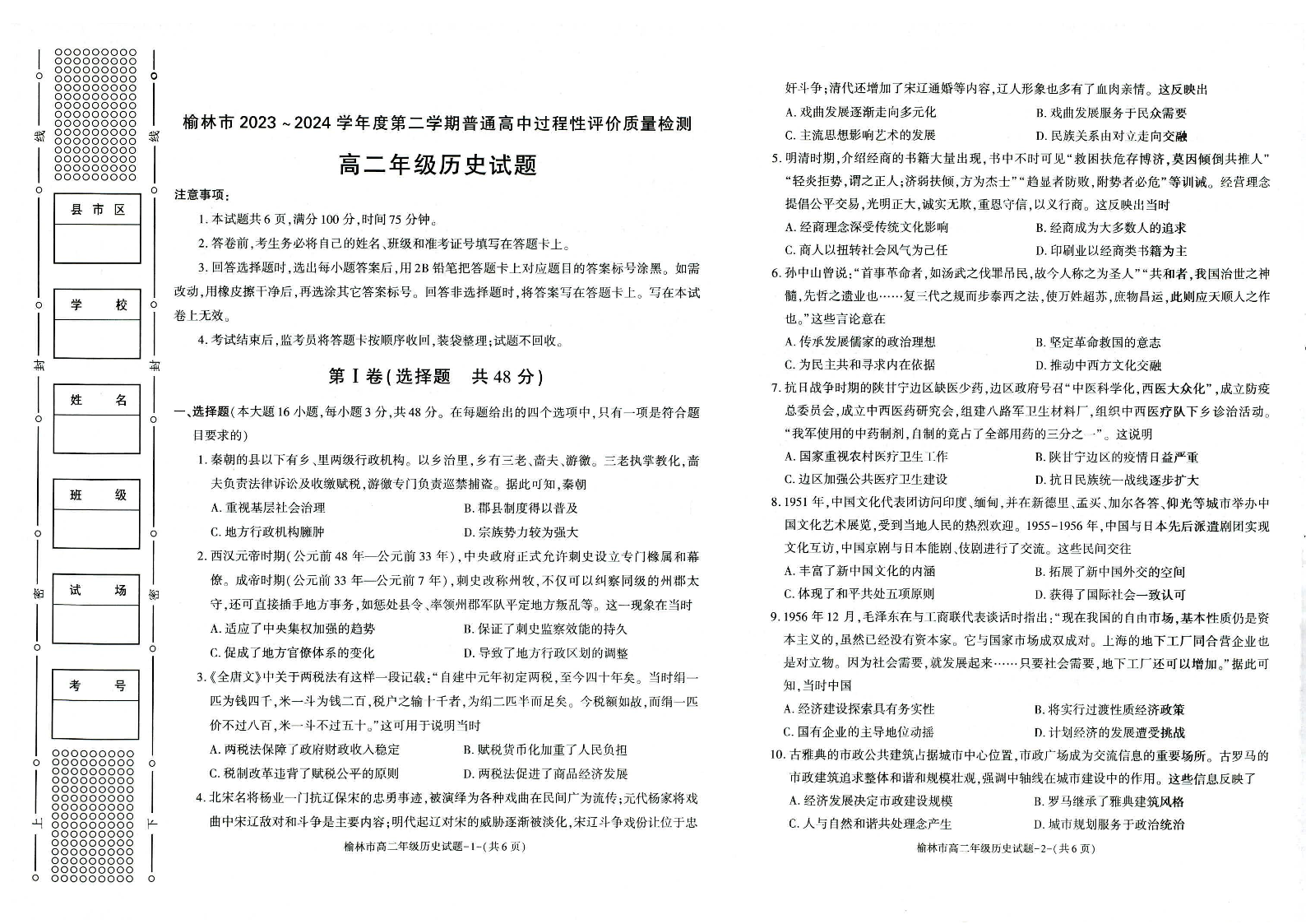 榆林2023-2024学年度高二第二学期期末校际联考 历史