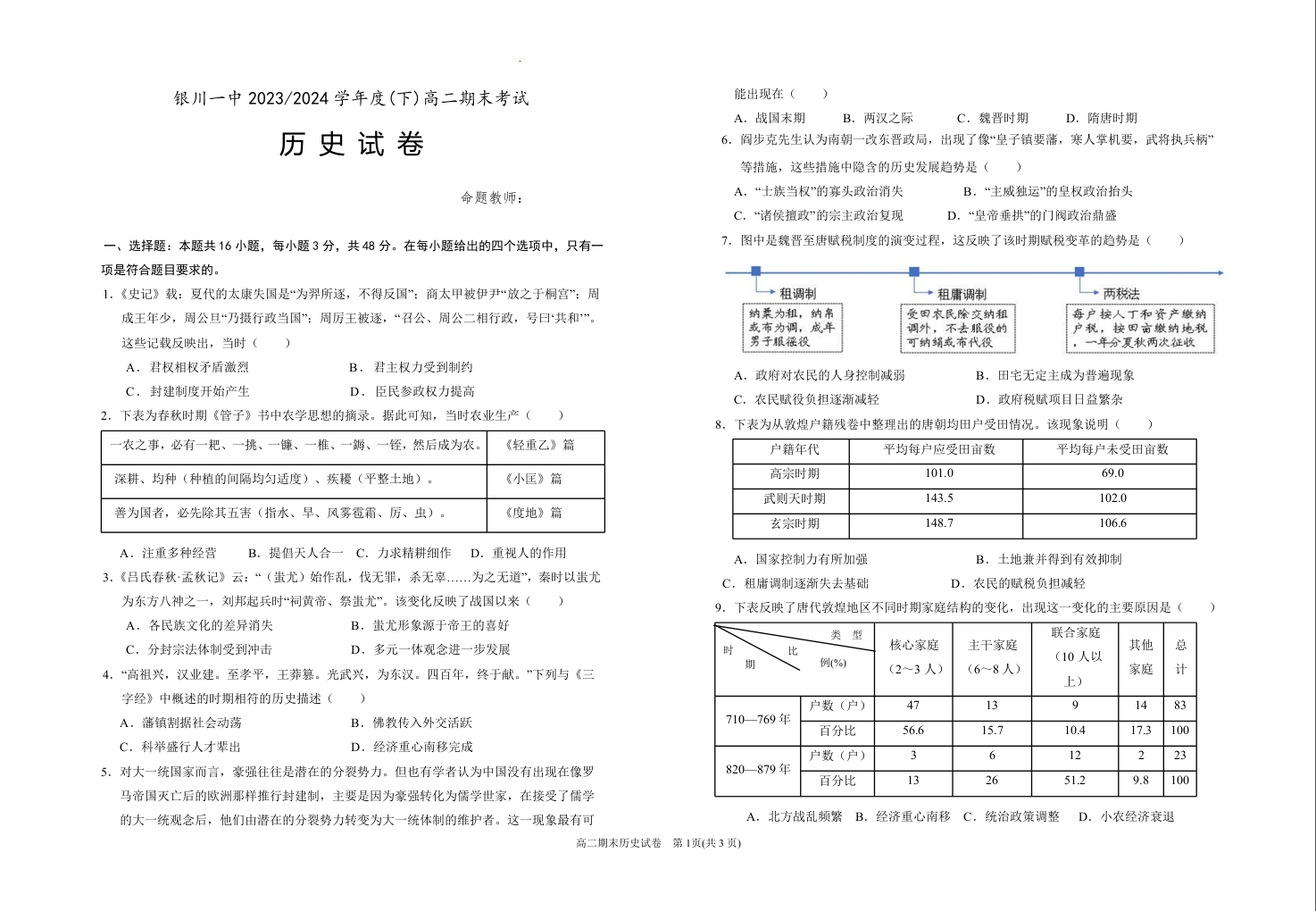 宁夏回族自治区银川一中2023-2024学年高二下学期期末考试 历史