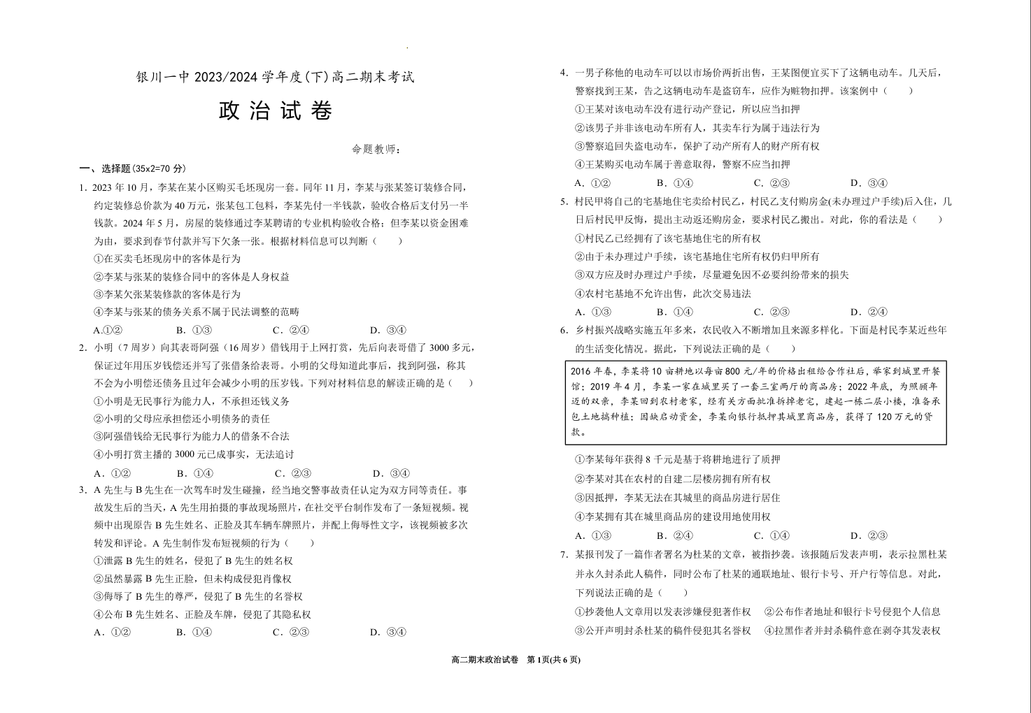 宁夏回族自治区银川一中2023-2024学年高二下学期期末考试 政治