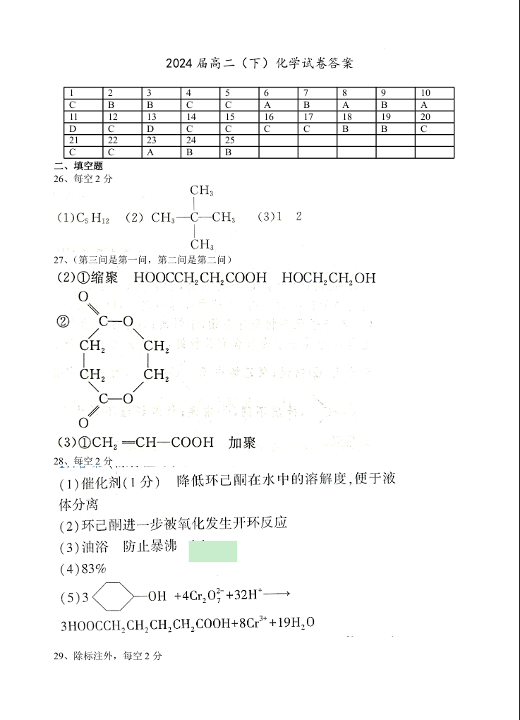 宁夏回族自治区银川一中2023-2024学年高二下学期期末考试 化学答案