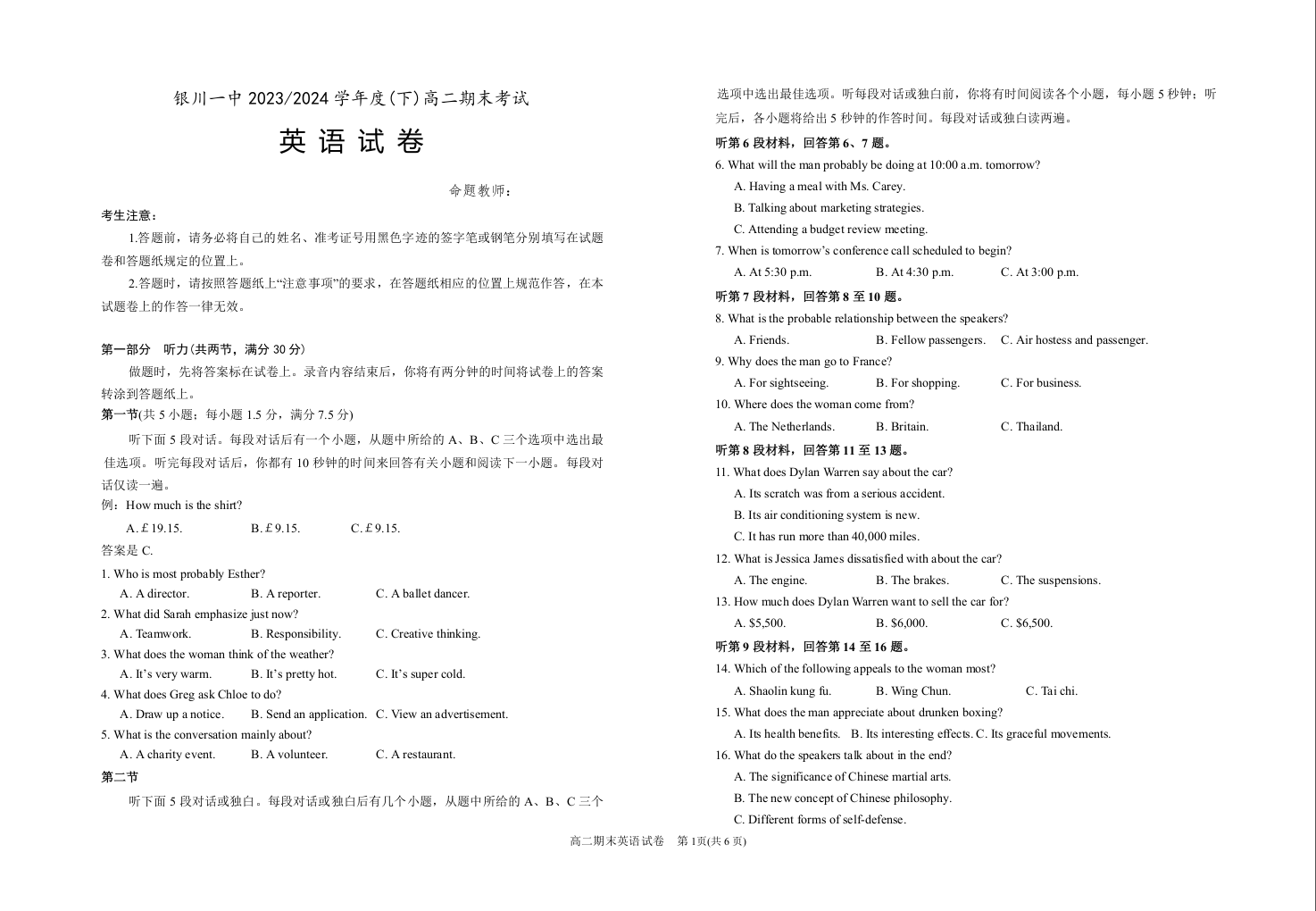 宁夏回族自治区银川一中2023-2024学年高二下学期期末考试 英语