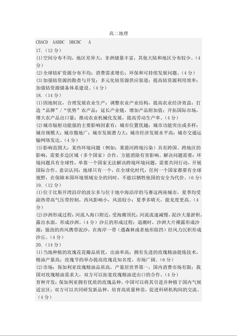 陕西省渭南市大荔县2023-2024学年高二下学期期末质量检测 地理答案