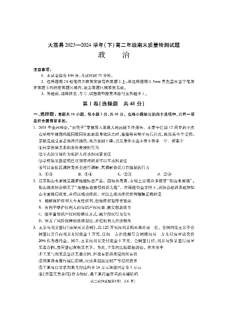 陕西省渭南市大荔县2023-2024学年高二下学期期末质量检测 政治