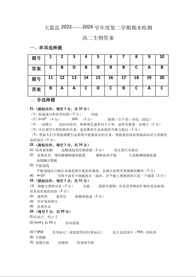 陕西省渭南市大荔县2023-2024学年高二下学期期末质量检测 生物答案