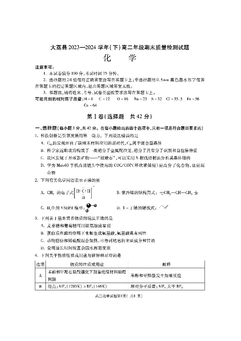 陕西省渭南市大荔县2023-2024学年高二下学期期末质量检测 化学