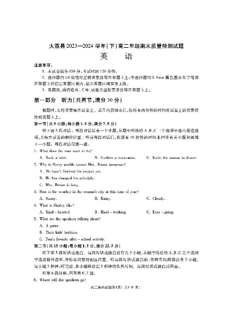 陕西省渭南市大荔县2023-2024学年高二下学期期末质量检测 英语