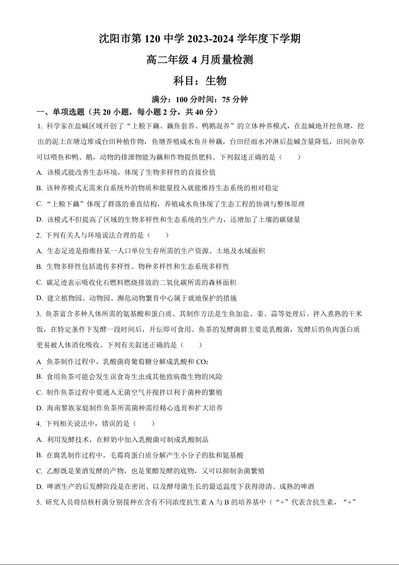 辽宁省沈阳市第一二〇中学2023-2024学年高二下学期第二次质量监测 生物