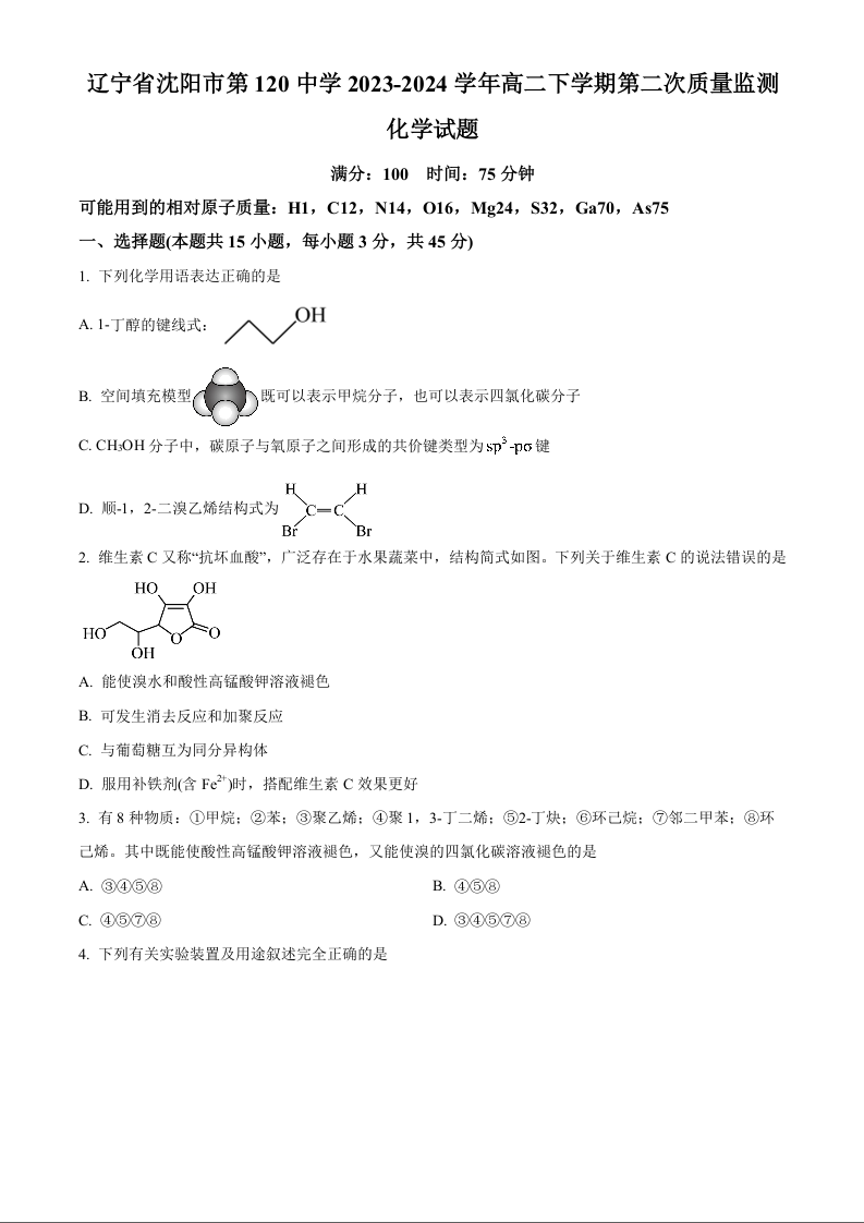 辽宁省沈阳市第一二〇中学2023-2024学年高二下学期第二次质量监测 化学