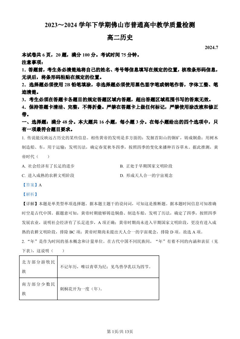 广东省佛山市2023~2024学年下学期普通高中教学质量检测 历史答案