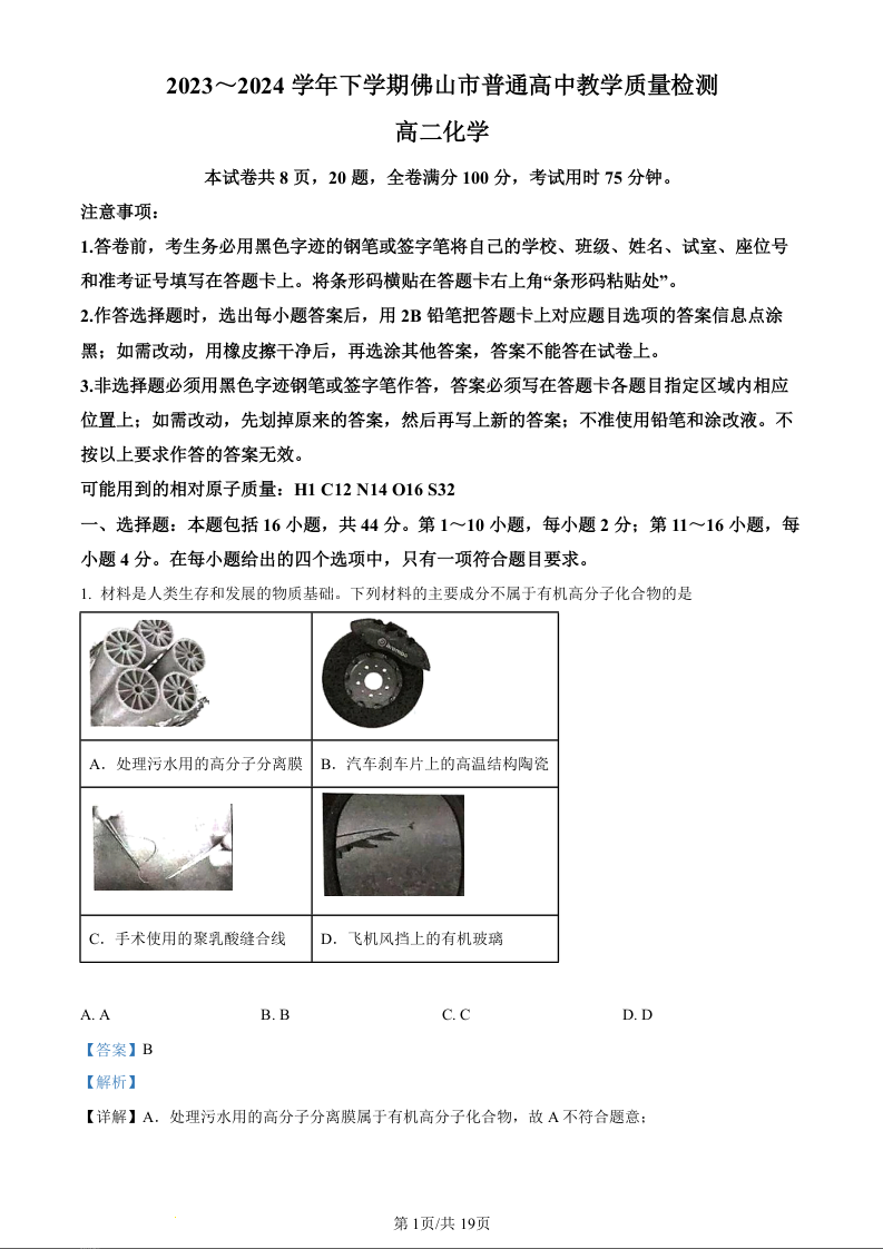 广东省佛山市2023~2024学年下学期普通高中教学质量检测 化学答案