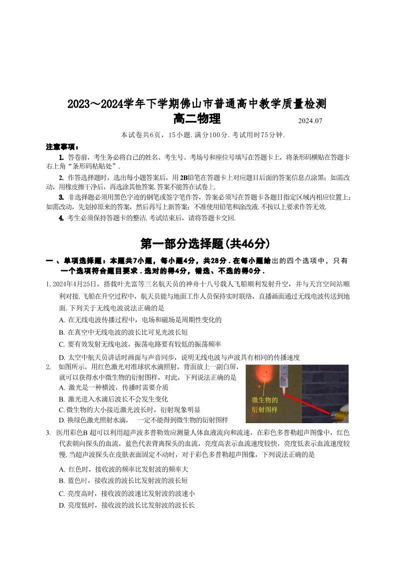 广东省佛山市2023~2024学年下学期普通高中教学质量检测 物理