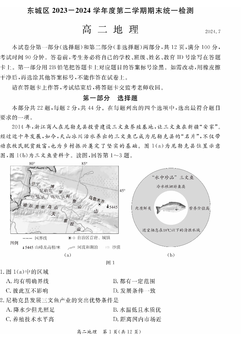 北京市东城区2023-2024学年度第二学期期末统一检测 地理