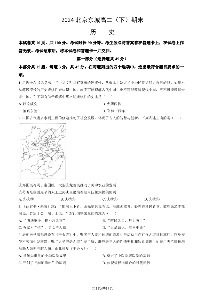 北京市东城区2023-2024学年度第二学期期末统一检测 历史