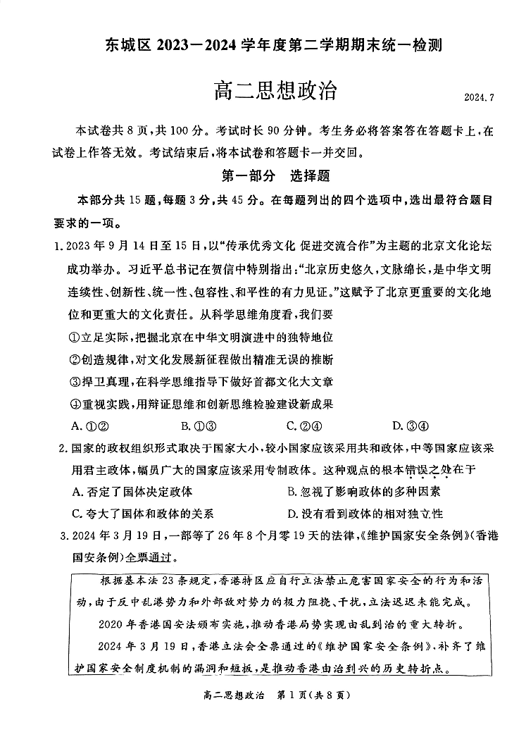 北京市东城区2023-2024学年度第二学期期末统一检测 政治