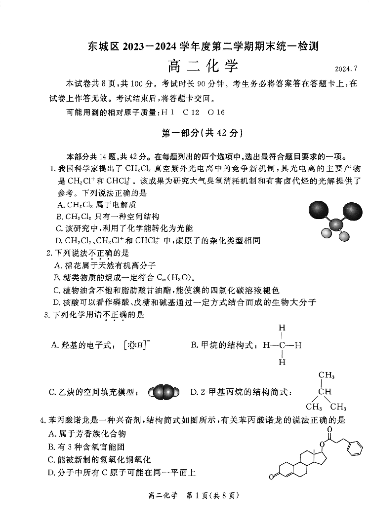北京市东城区2023-2024学年度第二学期期末统一检测 化学
