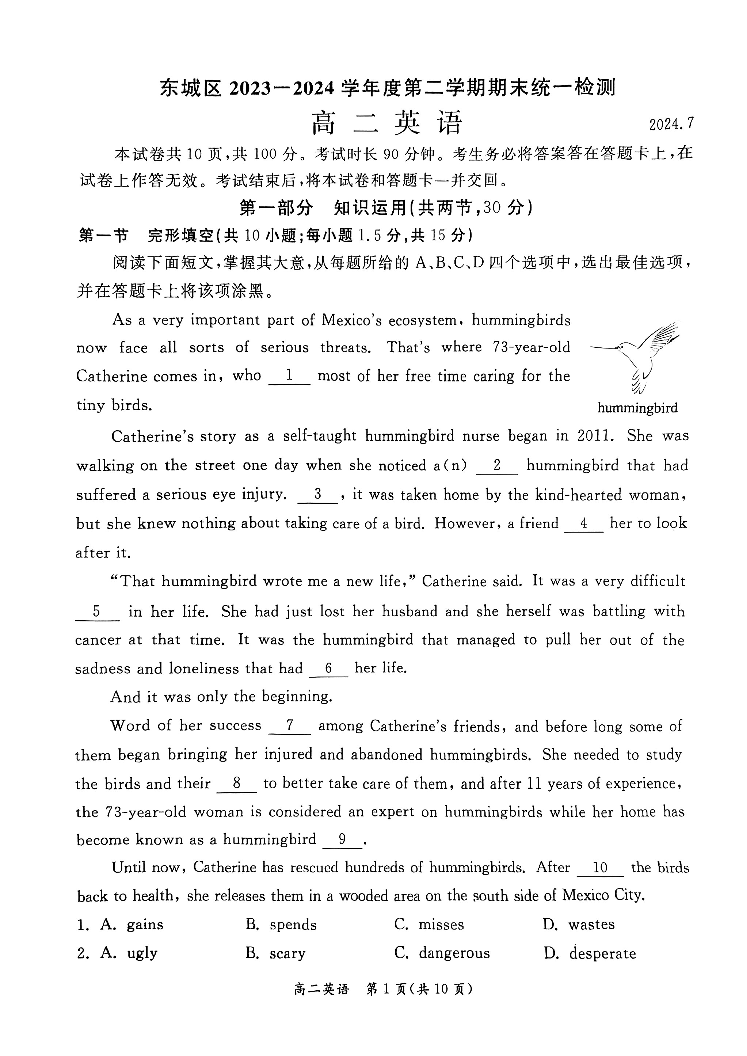 北京市东城区2023-2024学年度第二学期期末统一检测 英语