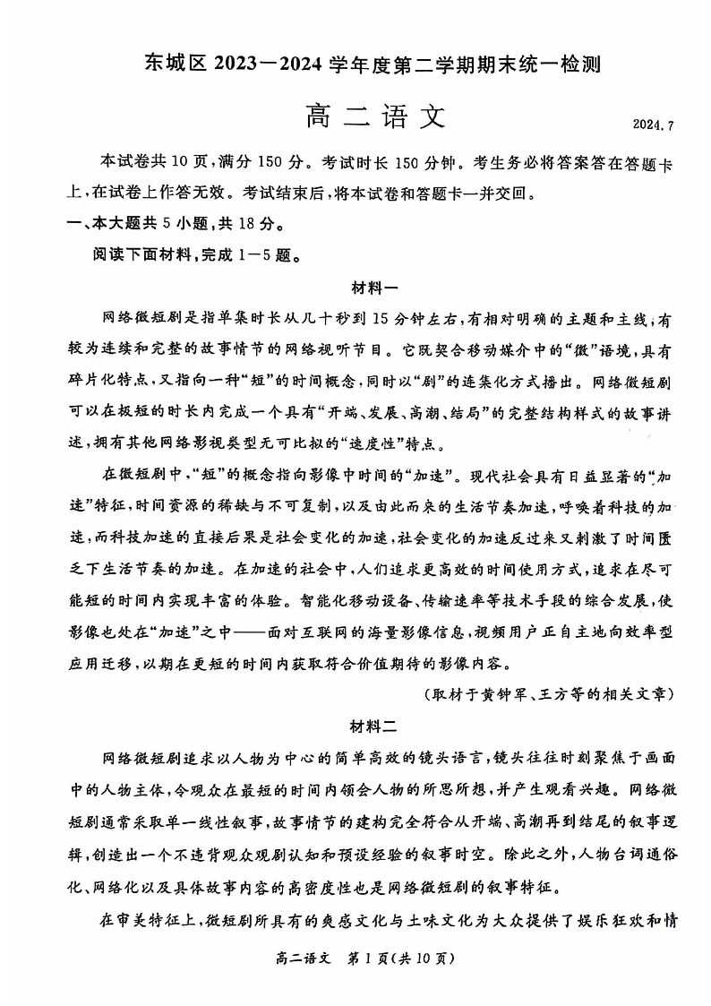 北京市东城区2023-2024学年度第二学期期末统一检测 语文