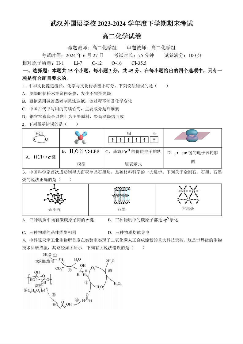 武汉外国语学校2023-2024学年度高二下学期期末考试 化学