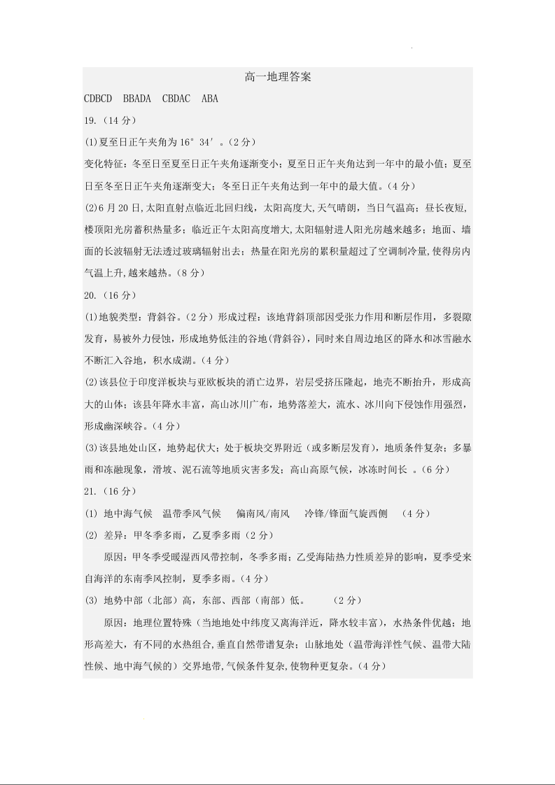 陕西省渭南市大荔县2023-2024学年高一下学期期末质量检测 地理答案