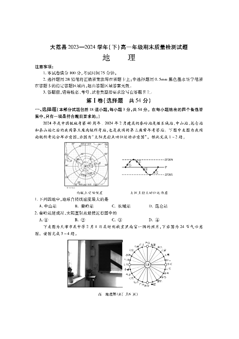 陕西省渭南市大荔县2023-2024学年高一下学期期末质量检测 地理
